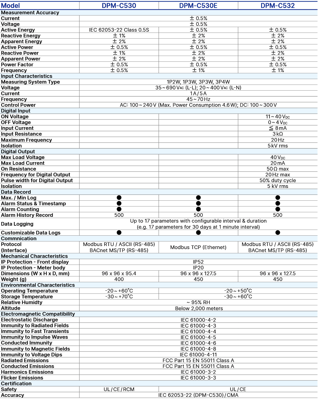 - Complies with IEC62053-22 Class 0.5S in active energy accuracy (DPM-C530)