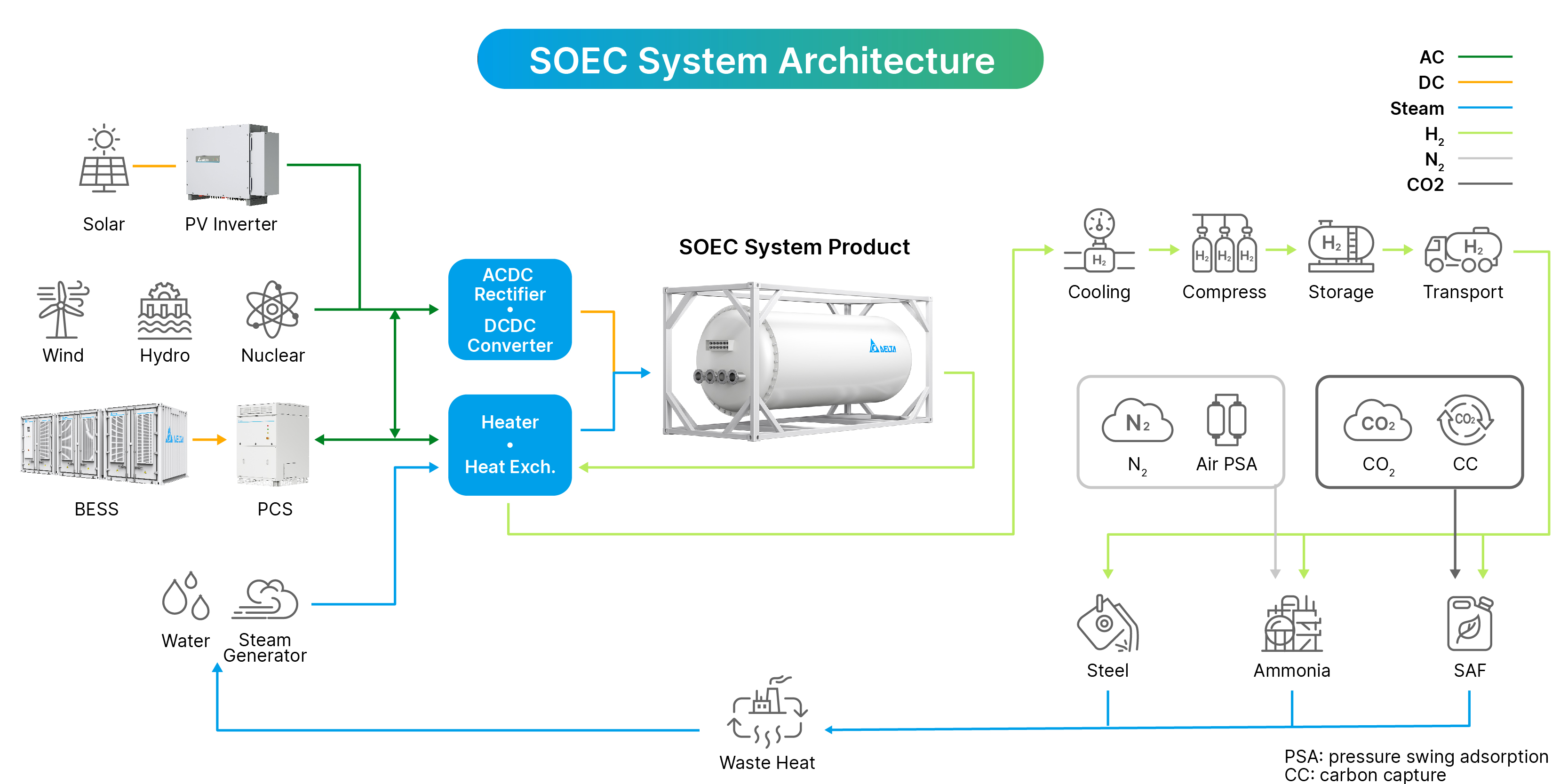 Delta's Solid Oxide Electrolysis Cell (SOEC) technology reforms water molecules into hydrogen and oxygen through high-temperature electrolysis. Compared to traditional water electrolysis hydrogen production technologies, SOEC offers higher efficiency and lower costs, effectively assisting high-carbon emission industries in accelerating their decarbonization transition.